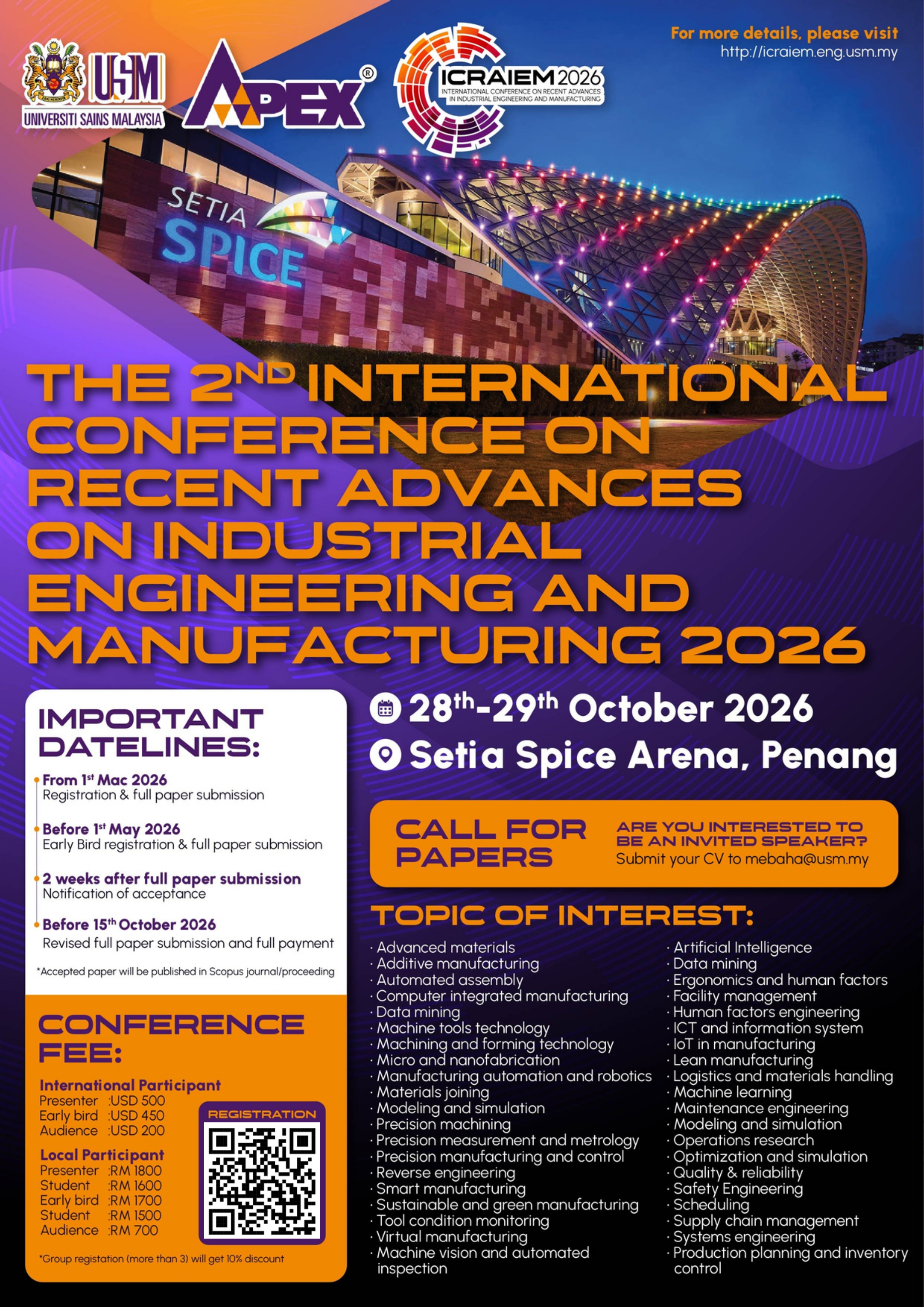 The ICRAIEM 2026 conference, organized by the School of Mechanical Engineering, Universiti Sains Malaysia, will be held in Penang, Malaysia, from 28-29 October 2026. ICRAIEM 2026 will be a large technical event focusing with this year theme Smart Manufacturing: AI and Sustainability in Engineering Innovation will provide a stimulating forum for scientists, engineers, educators, researchers, manufacturers and scholars from all over the world to disseminate their new research findings and exchange information on emerging areas of research in the emerging fields of manufacturing and industrial engineering. ICRAIEM 2026 will also serve as a platform for participants to get in touch with their peers who share similar research interests. The scope of the papers to be presented in this conference includes (but not limited to) the following: